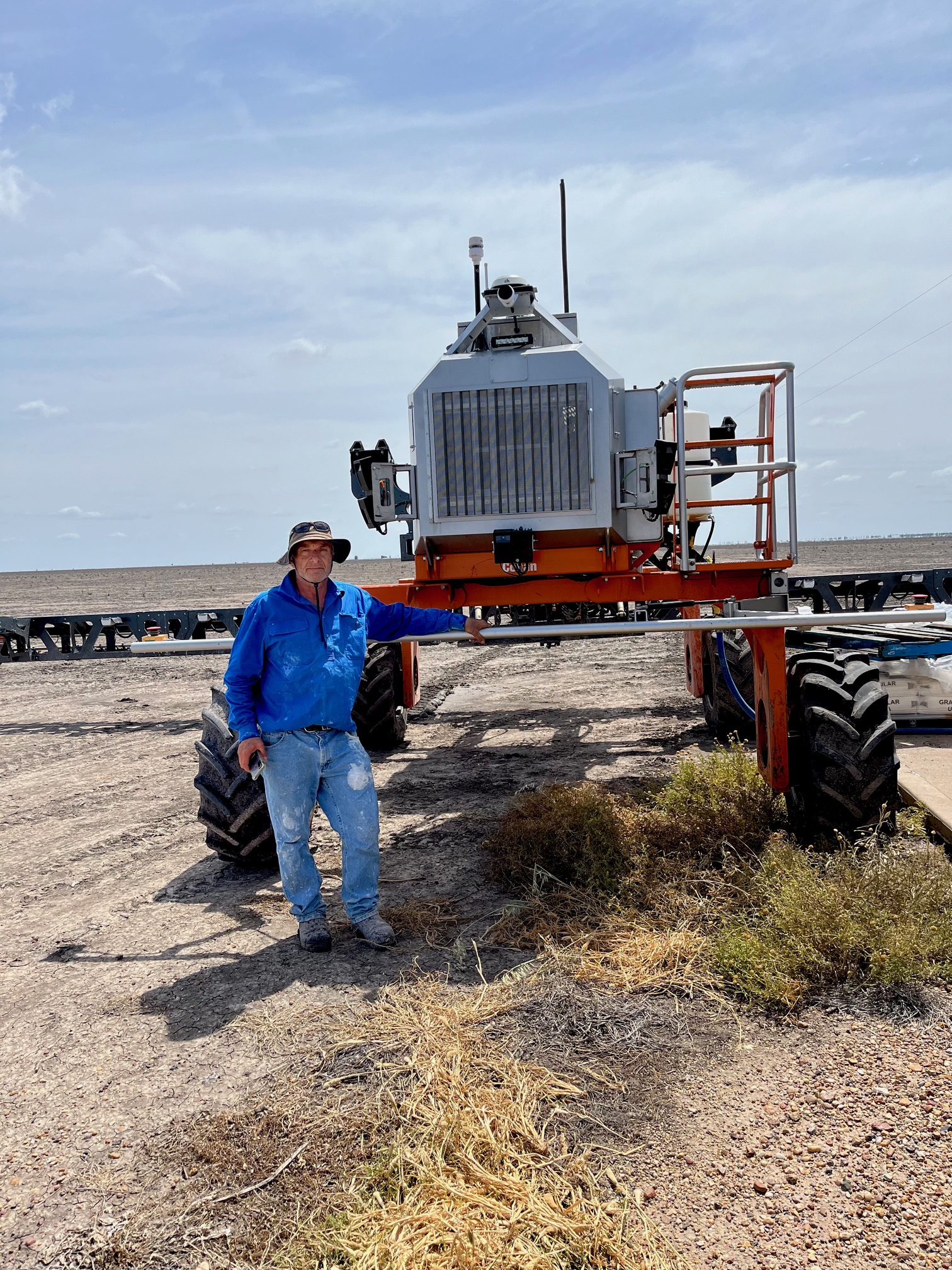 Robert uses the robotic spot sprayer to apply the double-knock tactic to target these weeds.
