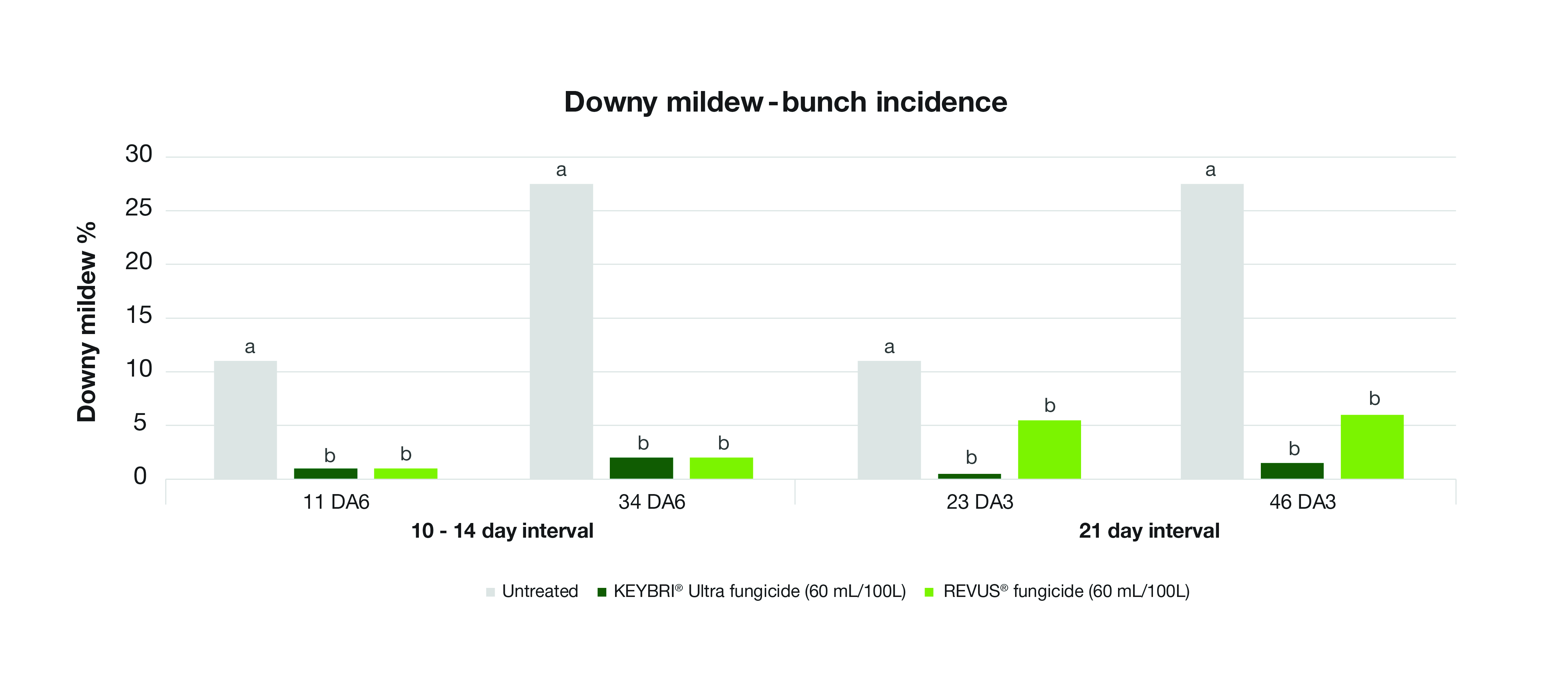 However, when the spray interval was extended to 21 days, trial results suggested that Keybri Ultra may offer superior performance and extended residual control of downy mildew, compared to Revus fungicide (Figure 1 and 2).