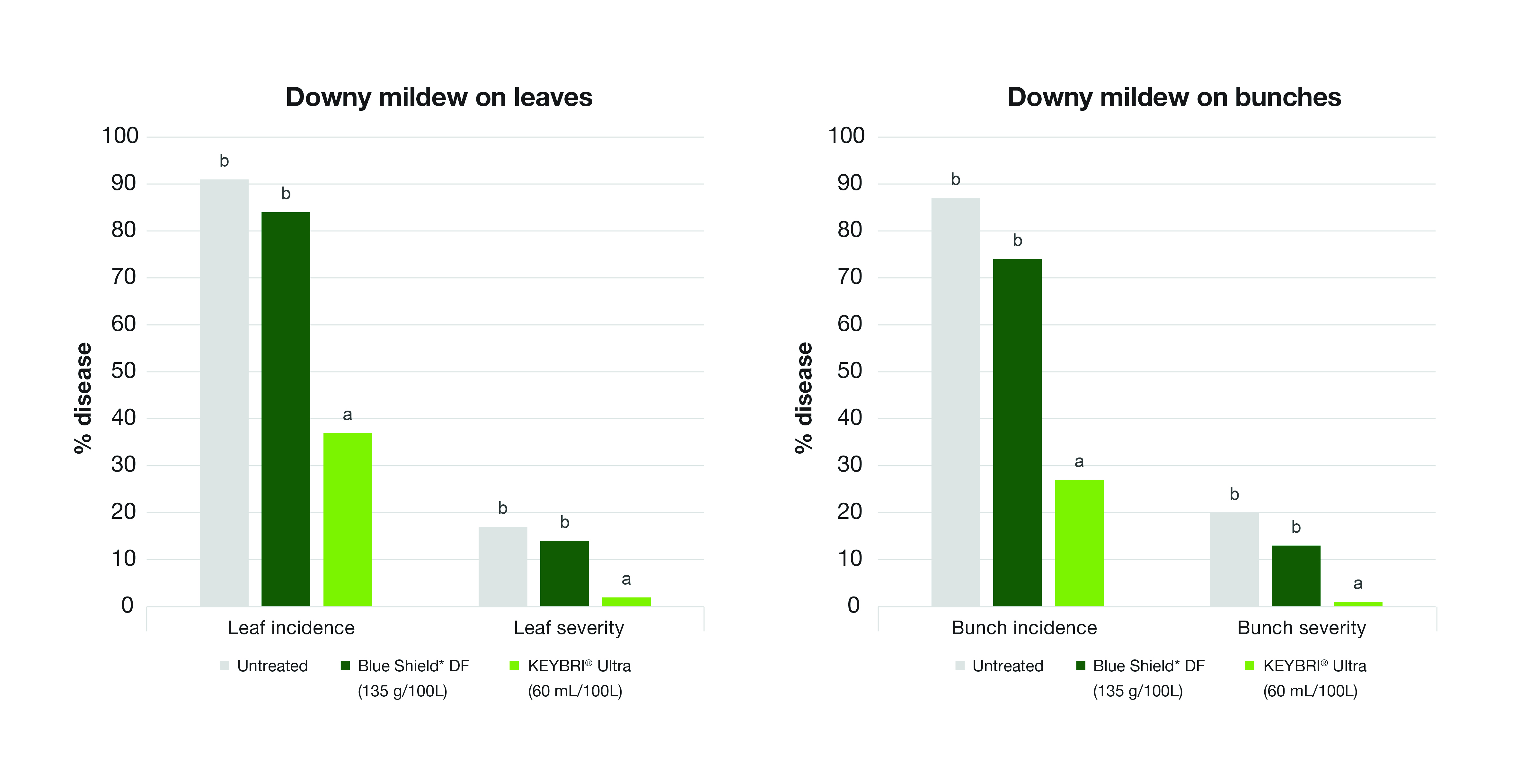 Keybri Ultra was compared to untreated vines, which received no early season downy mildew treatments and a copper treatment (Blue Shield* DF).