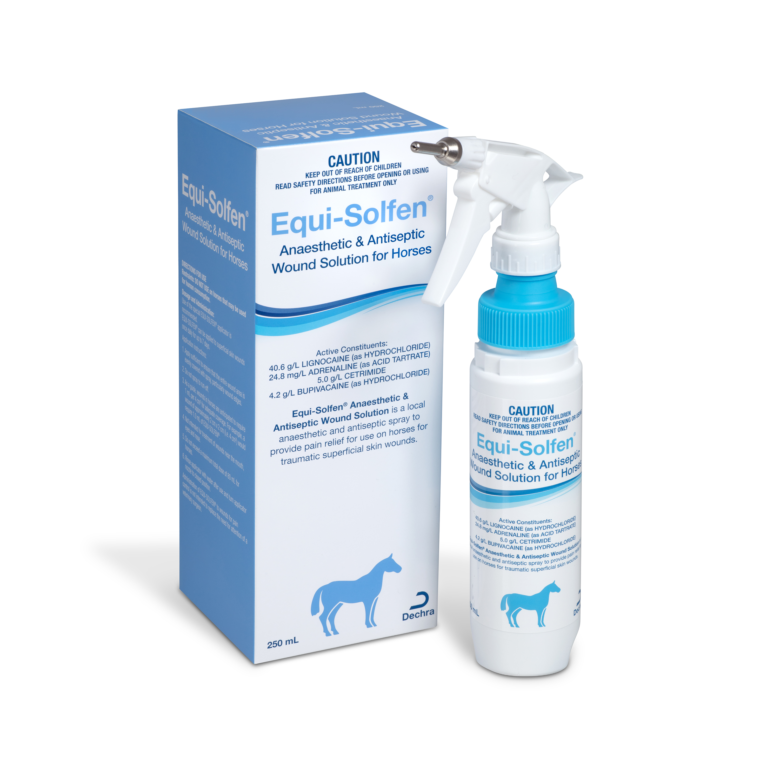Equi-Solfen contains lignocaine and bupivacaine, two local anaesthetics; adrenaline, which reduces bleeding and slows the inflammatory cascade and cetrimide, an antiseptic and surfactant that helps to start the healing process and protect against infection.