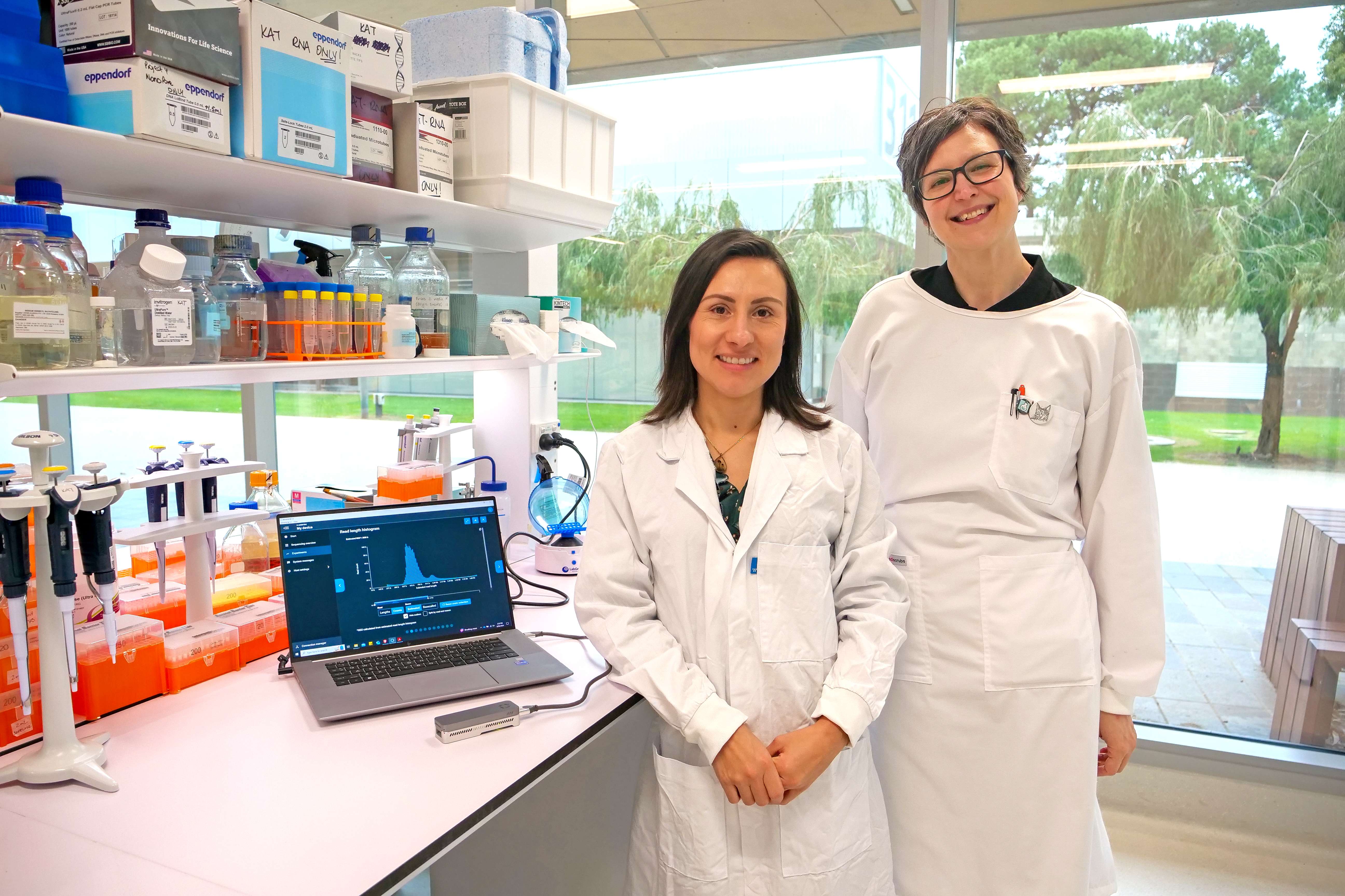 CCDM research assistant Ms Lina Farfan Caceres, and research fellow Dr Katherine Zulak in the lab with the MinION from Oxford Nanopore Technologies (UK).
